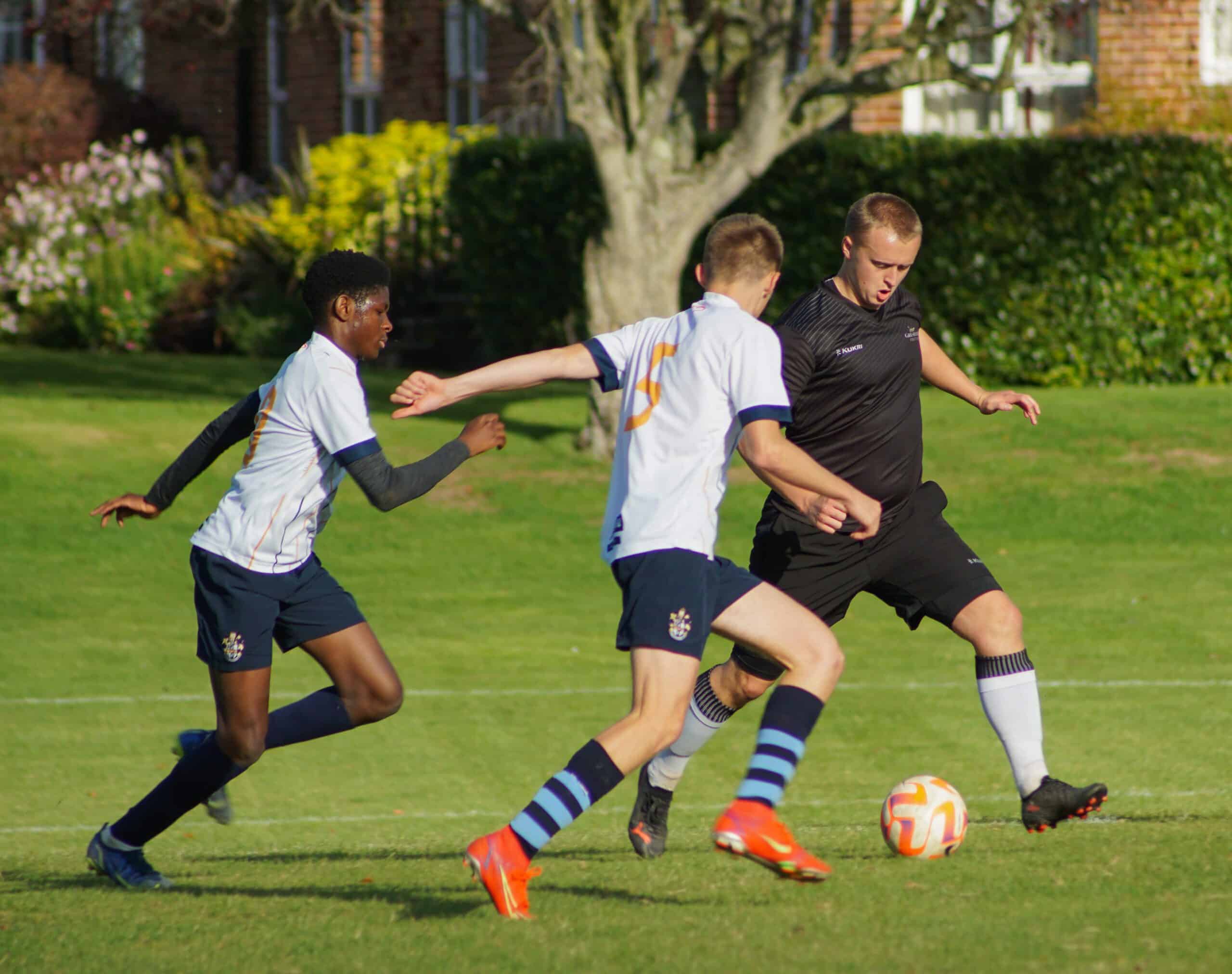 On Tuesday 11th October, the first team travelled to Woodbridge school and quickly dominated the opening exchanges of the game, going 1-0 from a confident Ru M finish when one on one with the keeper and this soon became 2-0 with a super finish on the volley from Charlie H. Max W scored the third before Ru M was brought down for a penalty, which was duly converted by Charlie H to take the score to 4-0 at half time.