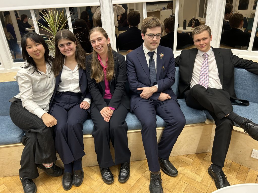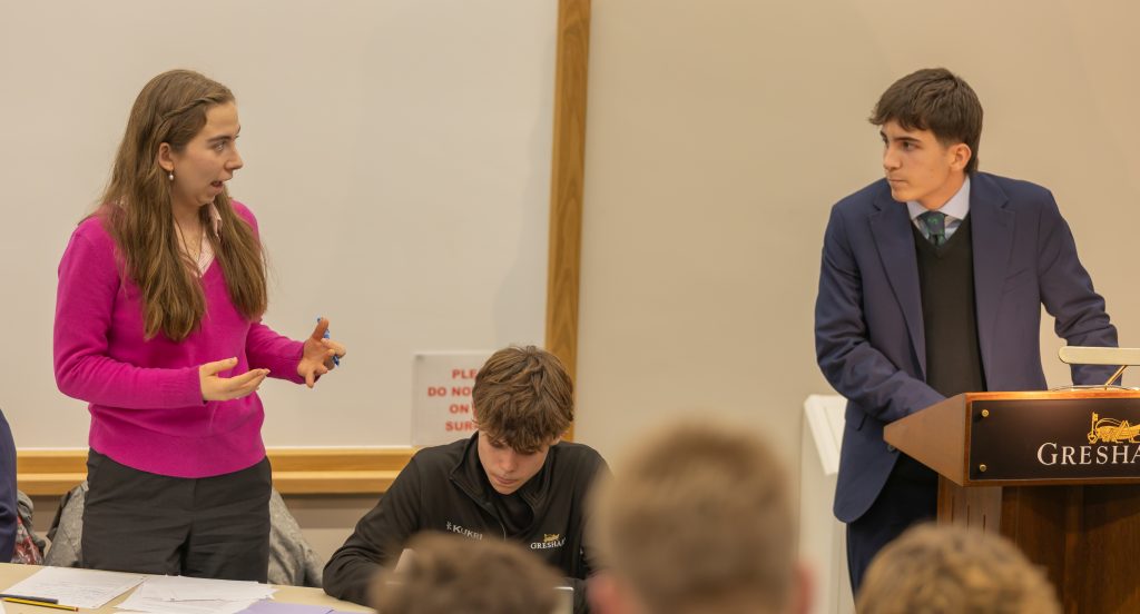 Monday evening witnessed a feast of fantastic debating. In the early part of the evening, two teams participated in the ESU Churchill Public Speaking Competition online first round heat, taking part in four matches. Grace C addressed the topic of always forgive your enemies, whilst Izzy D’A spoke about whether we need, or should avoid, boredom. Jemima P and Tilly C took on the role of Chair and Lewis H and Kitty R that of Questioner. Gresham’s A – Grace, Lewis and Jemima – progress to round 2, though both teams were excellent, especially as they were all novices in this competition.