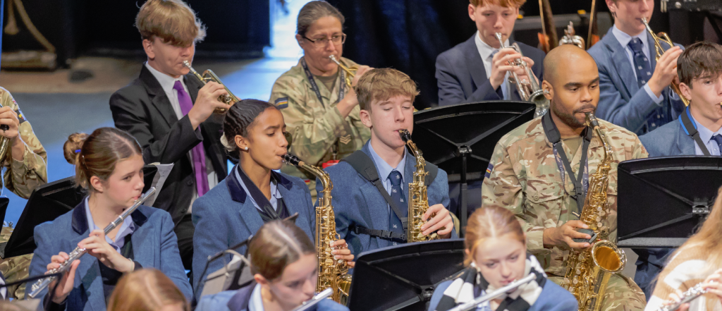 Gresham’s Music Department welcomed Colchester Army Band to the school for a workshop in partnership with Norfolk Music Services. Over 30 Gresham’s pupils from Years 9-13 were joined by 20 pupils from Norwich School, Thetford Academy, Springwood High School, King’s Lynn and Fakenham Academy to work on arrangements of popular Pop Music as well as more traditional pieces. It was evident from the outset and the initial Coldplay Medley piece that the standard for the day would be high and as a result, pupils were able to work through more complex music, including Ole Mountain Thyme and produce a wonderful sound.