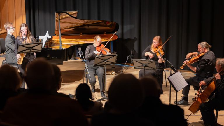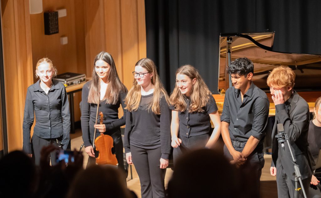 On Monday 3rd June, six of our foremost instrumentalists were given the rare opportunity to work with a professional string quartet in an evening workshop, developing their skills performing classical concert repertoire and leading an ensemble. They then went on to perform their solos alongside the quartet in a recital on Wednesday 5th June to a large and appreciative audience. Milan H arranged 8 minutes of music from John Powell’s soundtrack of How To Train Your Dragon for piano and string quartet which he very impressively performed from memory. Emily M performed a movement from Boccherini’s last Piano Quintet, Meg O on clarinet performed the lyrical ‘Forlana’ from Finzi’s Five Bagatelles and Ferdinand von D performed the slow movement of the 1st Piano Quintet by Louise Farrenc. Sophie L gave performances on both clarinet and saxophone – of the famous 2nd movement of the Mozart Clarinet Concerto and Shostakovich’s popular Waltz No 2, and Isadora A played the principal solo part in the second movement of Bach’s Double Violin Concerto.