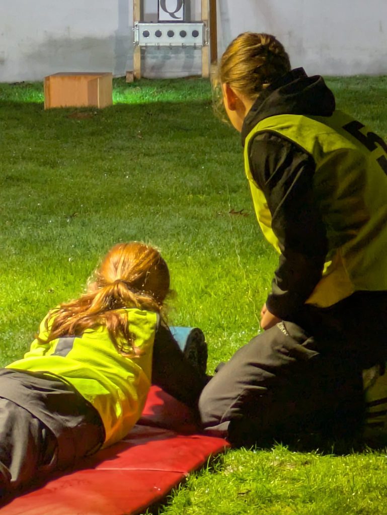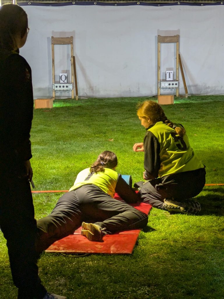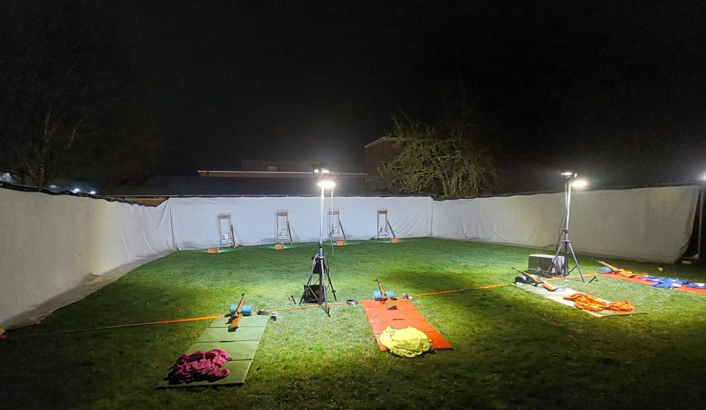 Each competitor was required to run 200 metres before coming into the air rifle range and shooting down five targets. Once the five targets had been knocked down, the next runner was able to set off around the track. The event was particularly exciting, taking place under floodlights at 8.00pm. Both the track and the range were floodlit to create a wonderful atmosphere.