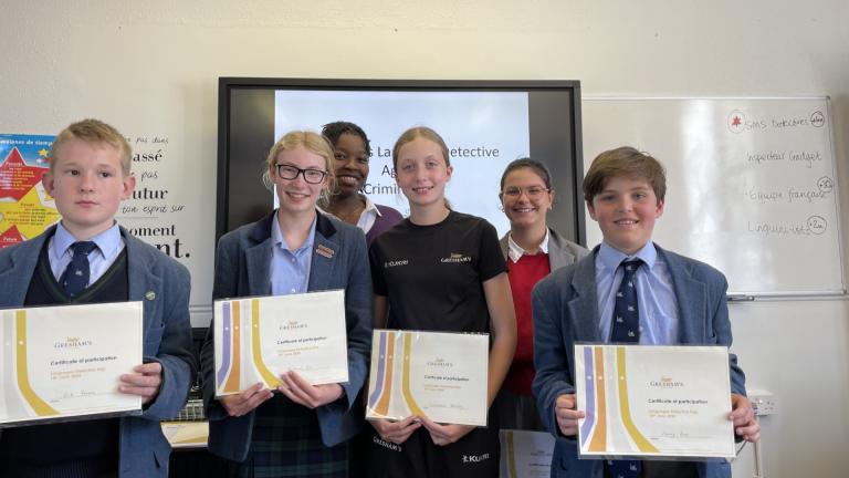 On Tuesday 18th June, the Modern Foreign Languages department welcomed 12 enthusiastic ‘language detectives’ to participate in a day of challenging linguistic activities. The Year 8 pupils came from Cromer Academy, North Walsham High School and Gresham’s Prep School. The day started with the pupils meeting each other and talking about their experiences with languages at school. Then they completed activities to get them thinking about the different facets of communication and language learning, from gesture and intonation to making links across languages. They were able to play Chinese Whispers in Czech, memorise objects in Welsh and analyse nonsense words in English!