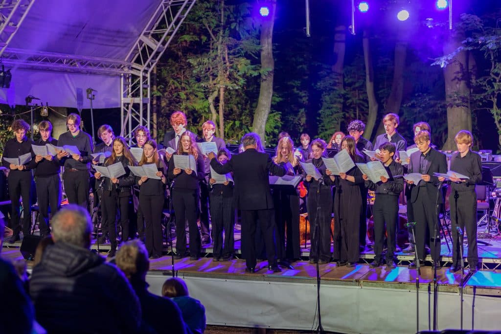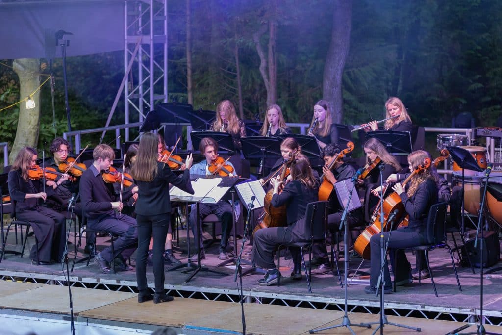 Any concert in Theatre in the Woods is special, purely because of its setting, a path leading to a wonderful open-air space with a leafy canopy and peaceful ambience. Add in an audience and a stage of musicians and the area, enhanced by lights, comes alive. It certainly did that on Thursday 25 May when the Music Department staged a ‘Music from the Movies’ Spectacular. A week of intensive rehearsals following weekly ensemble sessions since the beginning of the academic year showcased the passion and hard work of some 70 pupils as Concert Band, Orchestra, Marching Band, Brass Group, Strings Orchestra, Choirs and Soloists and House Band took a large and enthusiastic audience on a journey of music from the Silver Screen.