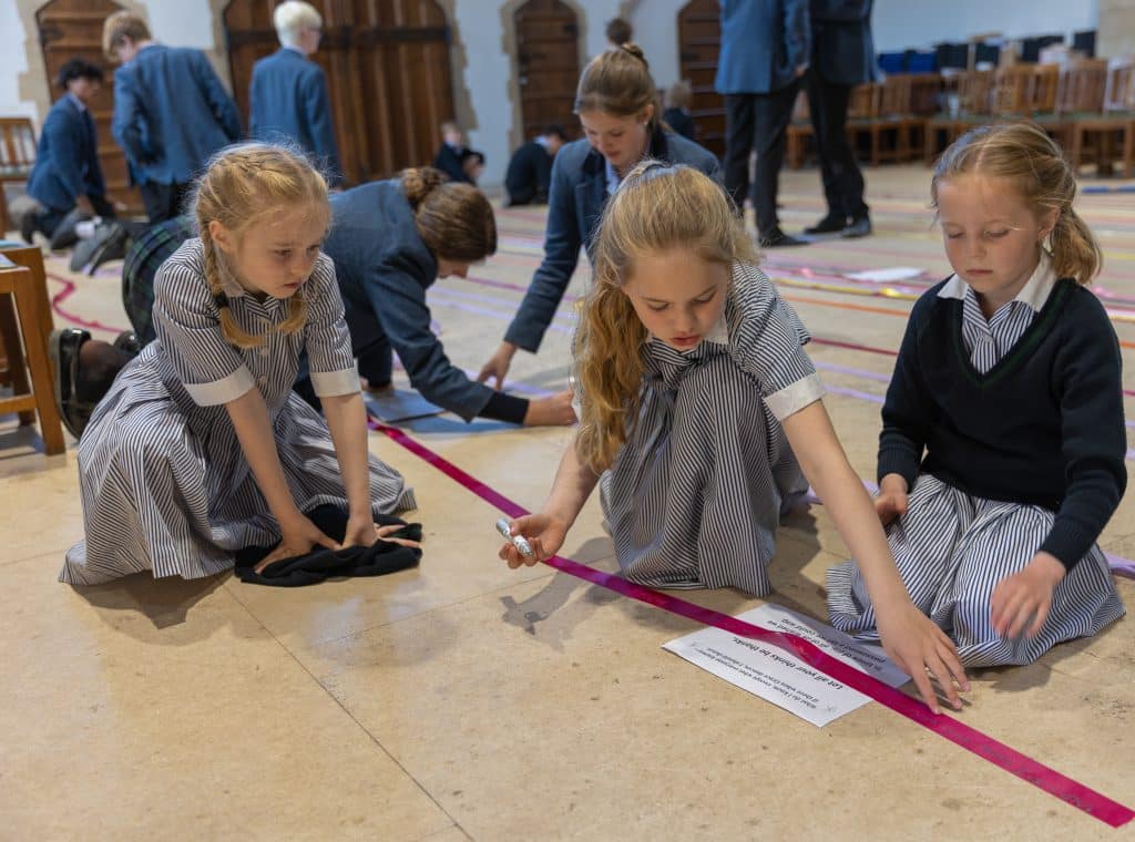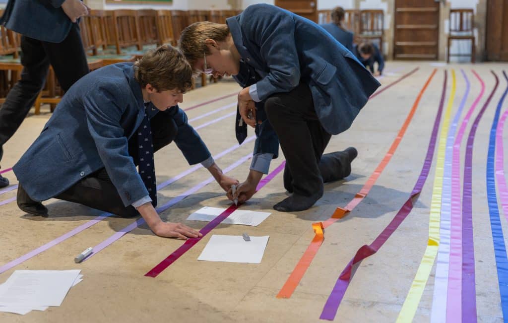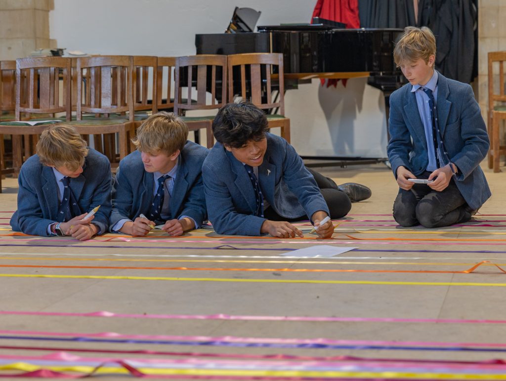 Just before the Whitsun half term break around 100 pupils from Gresham’s Prep and Senior Schools came together to create a new art installation in Chapel. The installation features 1000 metres of multihued ribbons cascading from the rafters which fill the space with a riot of colour: like streams of light connecting heaven and earth. Inspired by Old Greshamian W H Auden who died fifty years ago this year, pupils wrote words from his poem Whitsunday in Kirchstetten on each piece of ribbon to help us mark this significant anniversary as a school community. Whitsun is the festival in which the Christian church commemorates the coming of the Holy Spirit, and Auden is buried in Kirchstetten in Austria.