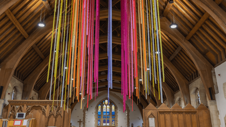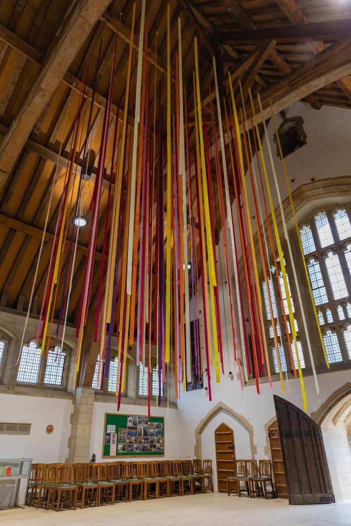 The different coloured ribbons contained in the piece are intended to match both the summer sunsets which come streaming through the West Window in Chapel and the stained-glass depiction of the Holy Spirit contained in the Chapel’s East Window.