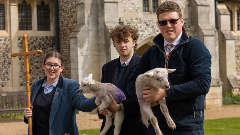 Pupils studying Agriculture at Gresham’s have been busy over the past couple of weeks caring for a group of very cute orphan lambs on the school site. Last weekend the lambs had a wonderful time exploring Chapel lawn in a special Good Shepherd themed Chapel service. Pupils Jack and Hugo gave an amusing and informative talk before fielding a variety of sheep related questions from pupils and staff.