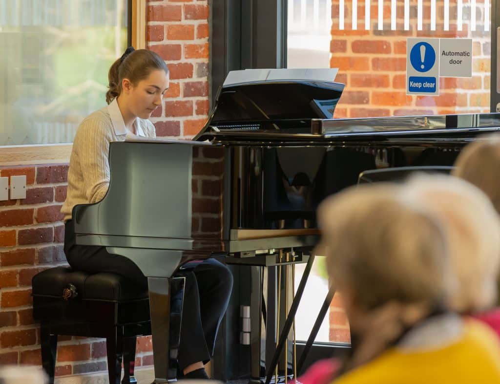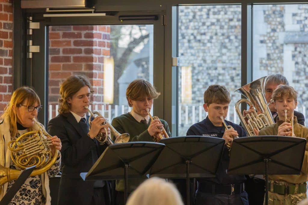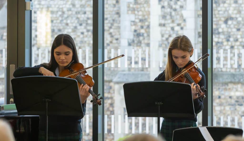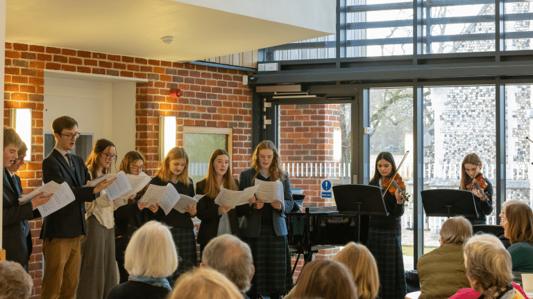 The final Music and Munch of term on Friday 8th December took on a suitably festive theme and to a full Tig’s tucking into delicious mince pies, the Year 9 Girls’ Choir started the lunchtime concert with Winter Song. Flute ensemble followed with Let it Snow (which luckily it didn’t start to do!) Other vocal and instrumental pieces included Crickets, accompanied by a String Quartet singing the first movement of the Pergolesi Magnificat, Amelia M-L performing Have yourself a merry little Christmas, a lively rendition of Camel stomp by Edie C on alto saxophone, and Olivia E’s ‘Almost there’ from the Princess and the Frog. Dana S impressed the audience with her beautiful violin playing of Concerto No. 1 by Komarowski and Brass Ensemble concluded with White Christmas and All I want for Christmas to send everyone home with a festive ear worm!