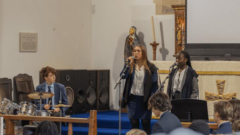 The termly Gospel service featured George R, Jemima T and Michelle W as our solo musicians. George R was a force to be reckoned with on the drum kit, as he performed assuredly with Mr Cooper and Mr Myers preceding the service. Michelle W sang ‘Everybody’s Free’, accompanied by Chapel Choir to begin the service, and her and Jemima T duetted beautifully for Stormzy’s ‘Give It To The Water’ and Whitney Houston’s ‘Step by Step’, accompanied by our band. Chapel Choir took their turn with a lively rendition of ‘When the Saints Go Marching in’, and the rest of the school had a chance to join in with the Gospel hymns, producing a marvellous sound in ‘Amazing Grace’, ‘When I needed a neighbour’, ‘Mine eyes have seen’ and, of course, ‘Shine Jesus Shine’.