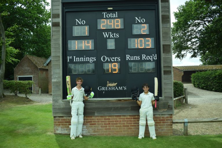Gresham’s won the toss and decided to bat, opening with the two best players and co-captains, Finley S and Oli C. Both boys batted brilliantly for the whole 20 overs, ending with both Finley (114 not out) and Oli (103 not out) making centuries and amassing a whopping 248 for 0. This was Finley’s first, but Oli’s third hundred of the season for the school.