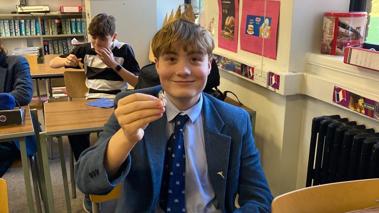 Our Year 10 pupils celebrated the new year in French with a slice from a ‘Gallette des Rois’ – a traditional French cake eaten on 6th January (and throughout January) to mark the feast of the Epiphany. Within the cake is hidden a ‘fève’ which used to be a bean, and is now a porcelain figure. The finder then gets to be King or Queen for the day. Congratulations to Henry for finding the fève!