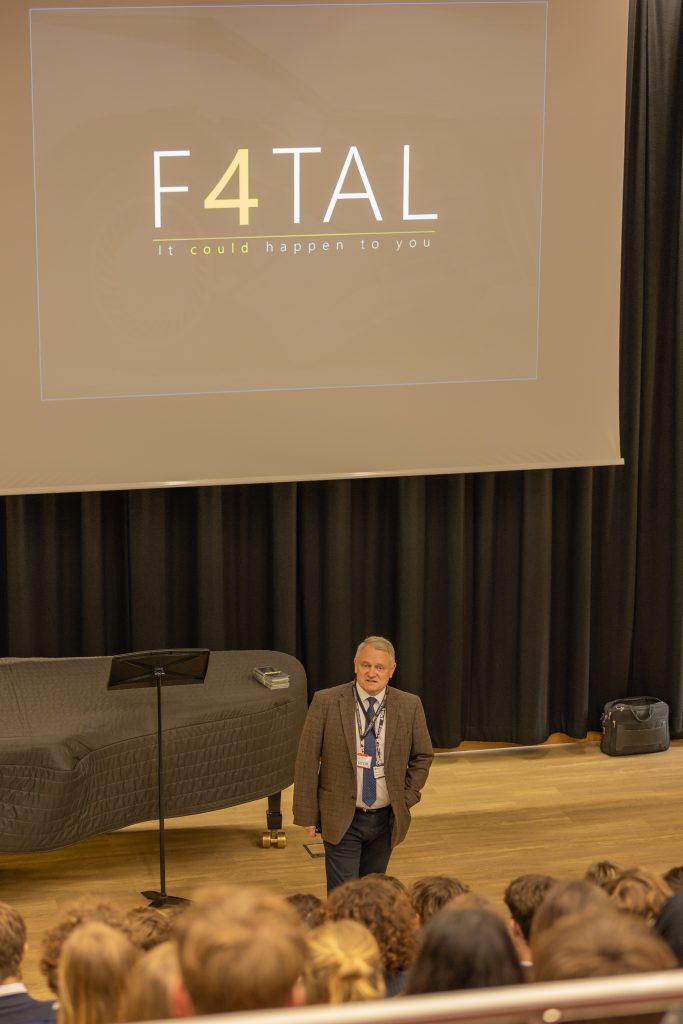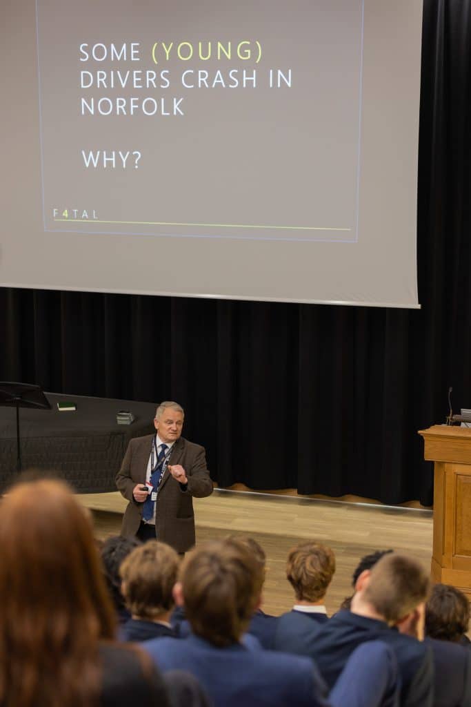 On 22nd May, as part of the Year 12 Wellbeing Programme, Andy Nattrass from the Norfolk Roads and Armed Policing Team made his annual visit to Gresham’s to deliver the ‘Fatal 4’ Young Driver presentation. He explained how the four main causes of accidents and injury on Norfolk roads are: speeding, alcohol and drugs, mobile phones and not wearing seat belts. He also showed interviews with young people who had had lucky escapes, hospital staff and traffic police.