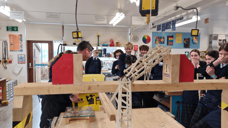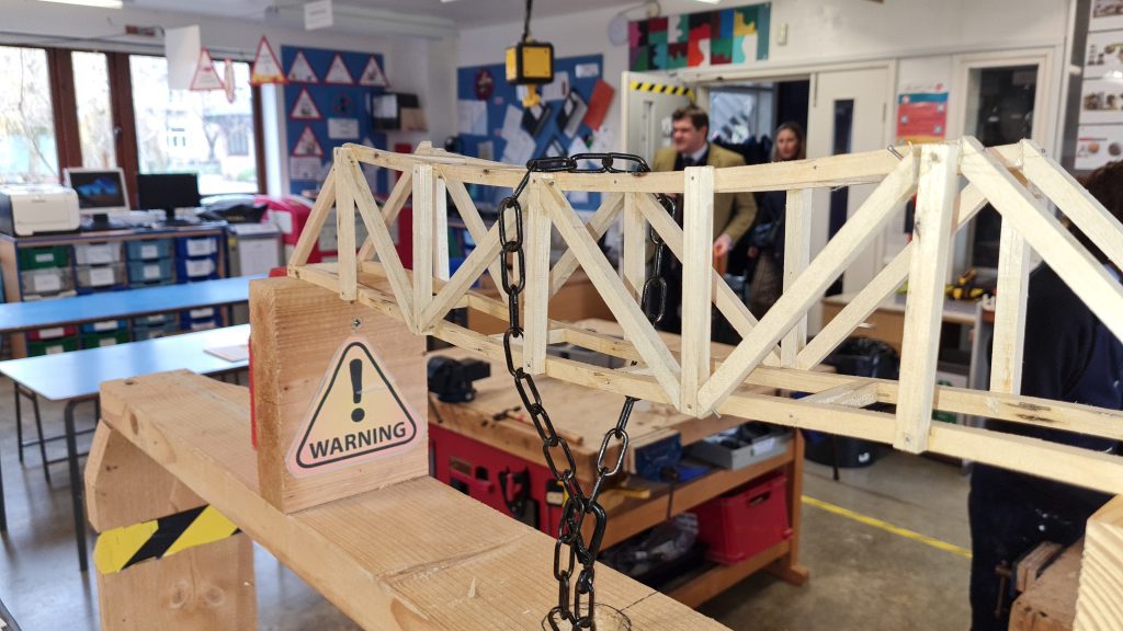 Year 8 destruction testing – pupils have built a bridge with set materials and then placed under load until the point of collapse. The current leading bridge held over 75kg before breaking; and the team are hoping to beat 100kg this year!