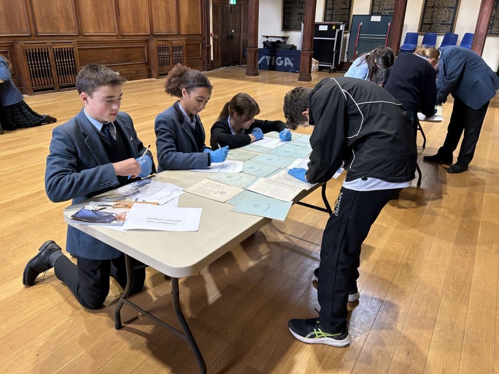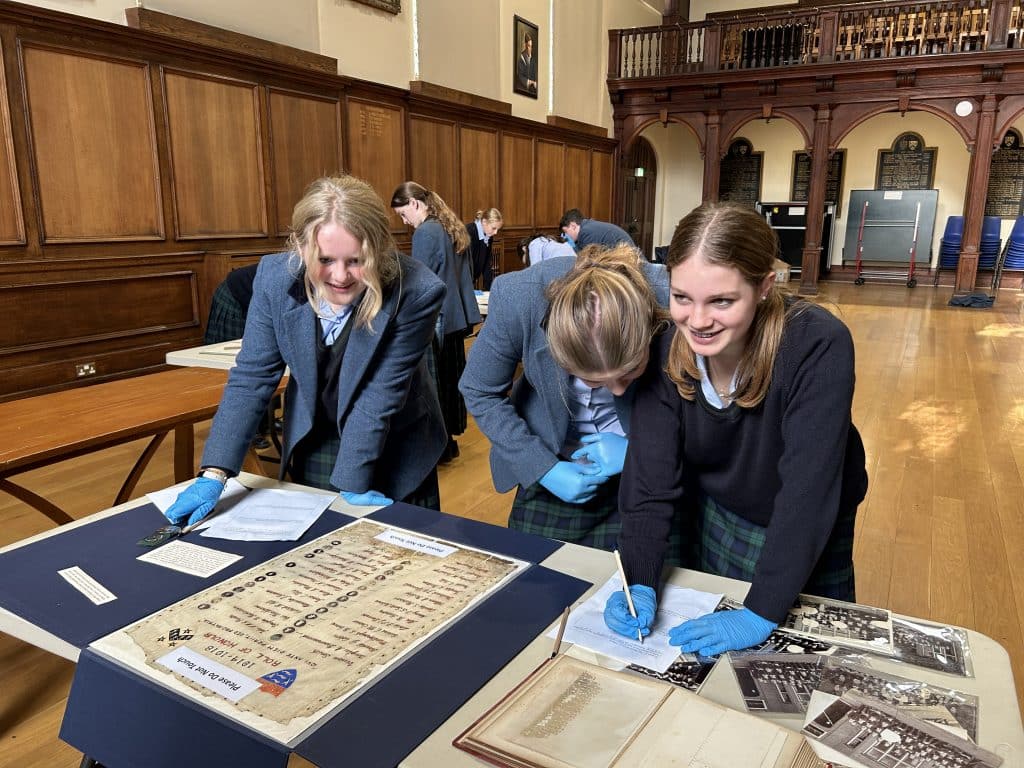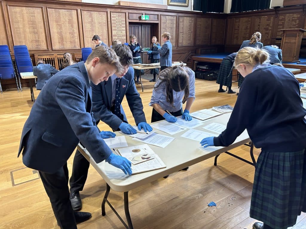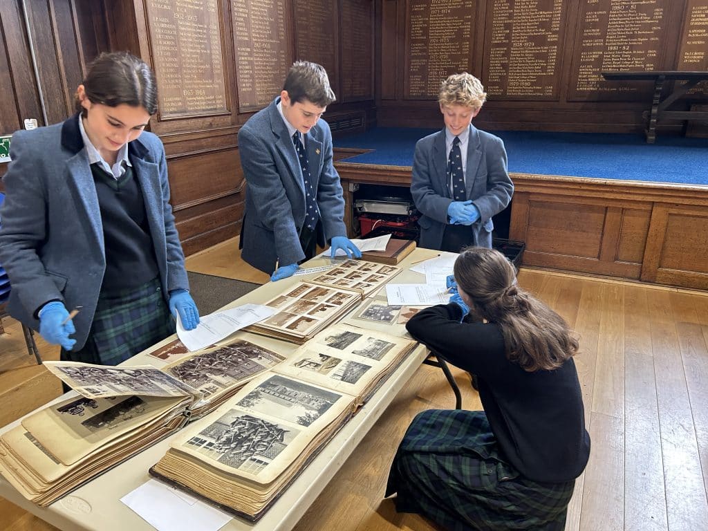 Year 9 pupils had the opportunity to get hands-on experience handling items such as contemporary newspaper cuttings, school magazines, the 1903 prospectus, the Vellum Roll of Honour for the boys of the junior school who were killed in action, recently donated photo albums and diaries from Dallas Wynne Willson, the housemaster of Old School House between 1905 and 1920, and special items relating to OGs Alec Heron and George Goodall who were both killed in action during the conflict.